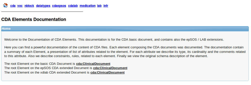 CDAGenerator offers a complete documentation of the structure of the CDA standard. It is the same description that we find in the schema of CDA R2. The documentation is generated from the UML model that describes the CDA standard. To access the documentation, you have to go to menu -> CDA Documentation -> CDA Content Documentation