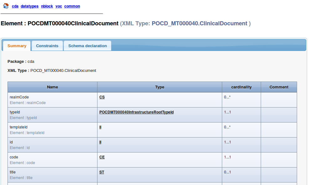 The html page that describes the Root element (ClinicalDocument) looks like this :