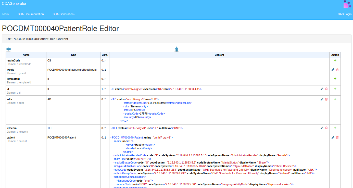 A new page will be opened containing the possibility to edit element by element each sub element of the root ClinicalDocument.